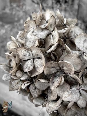 Skeletal hydrangea flowers in muted tones